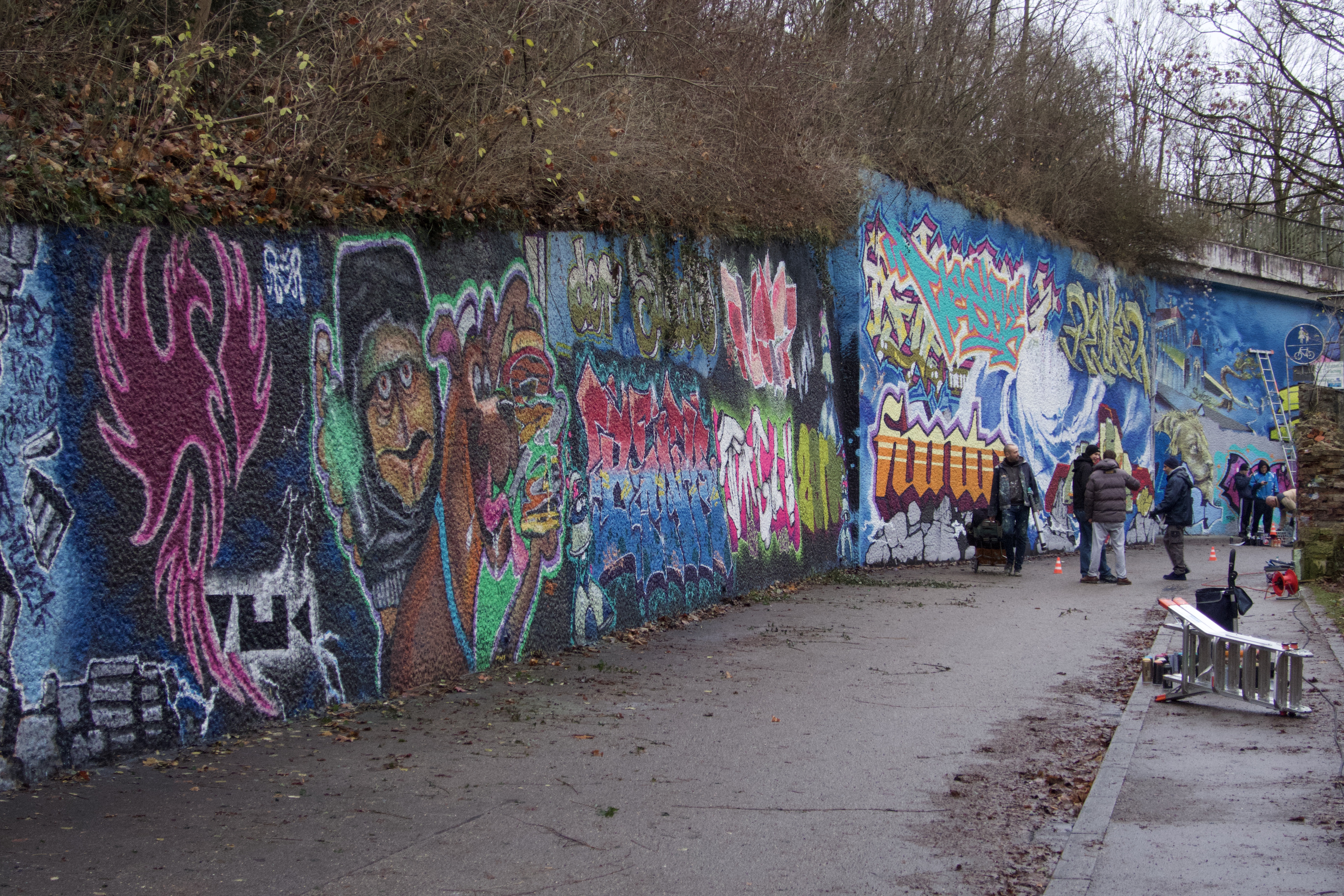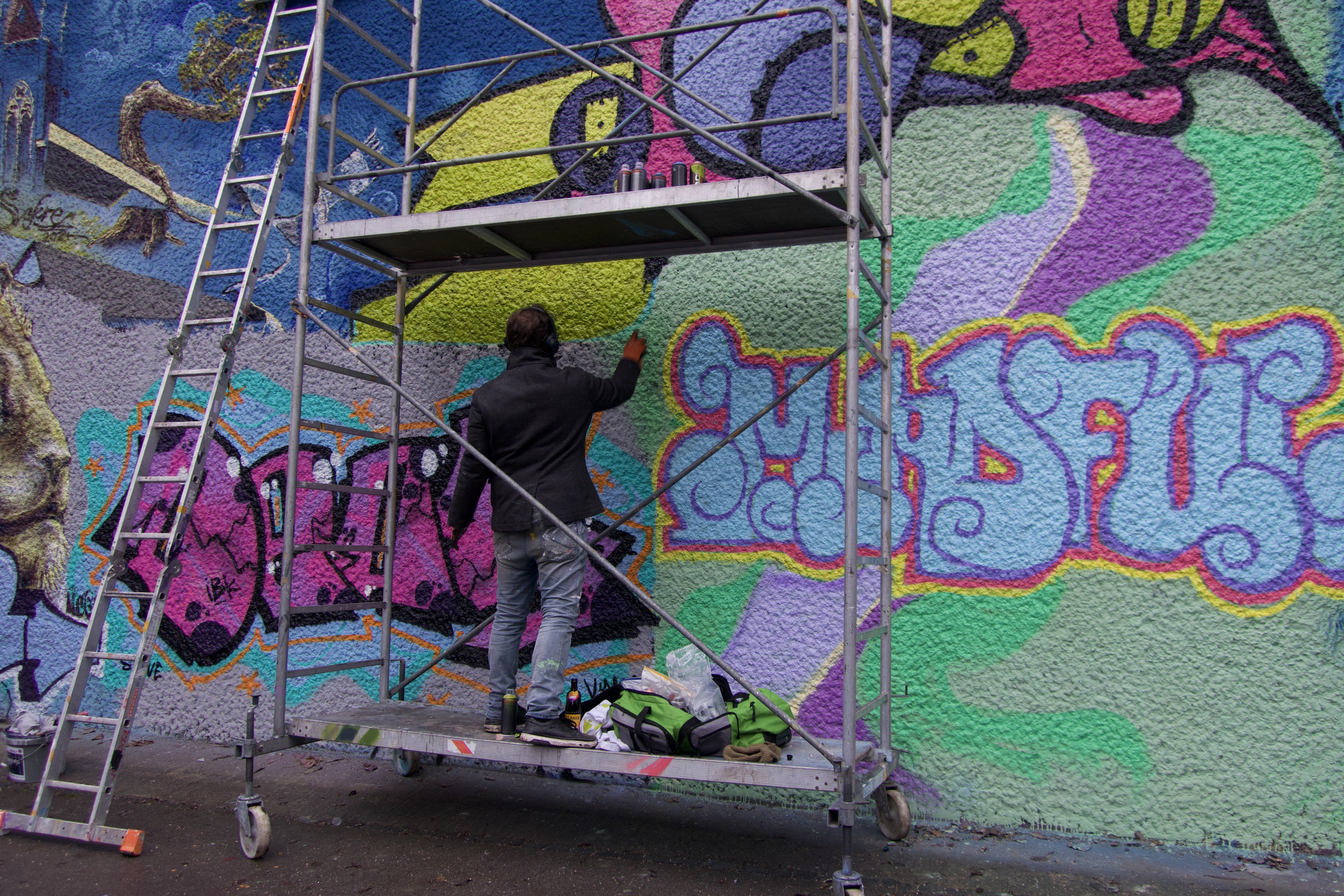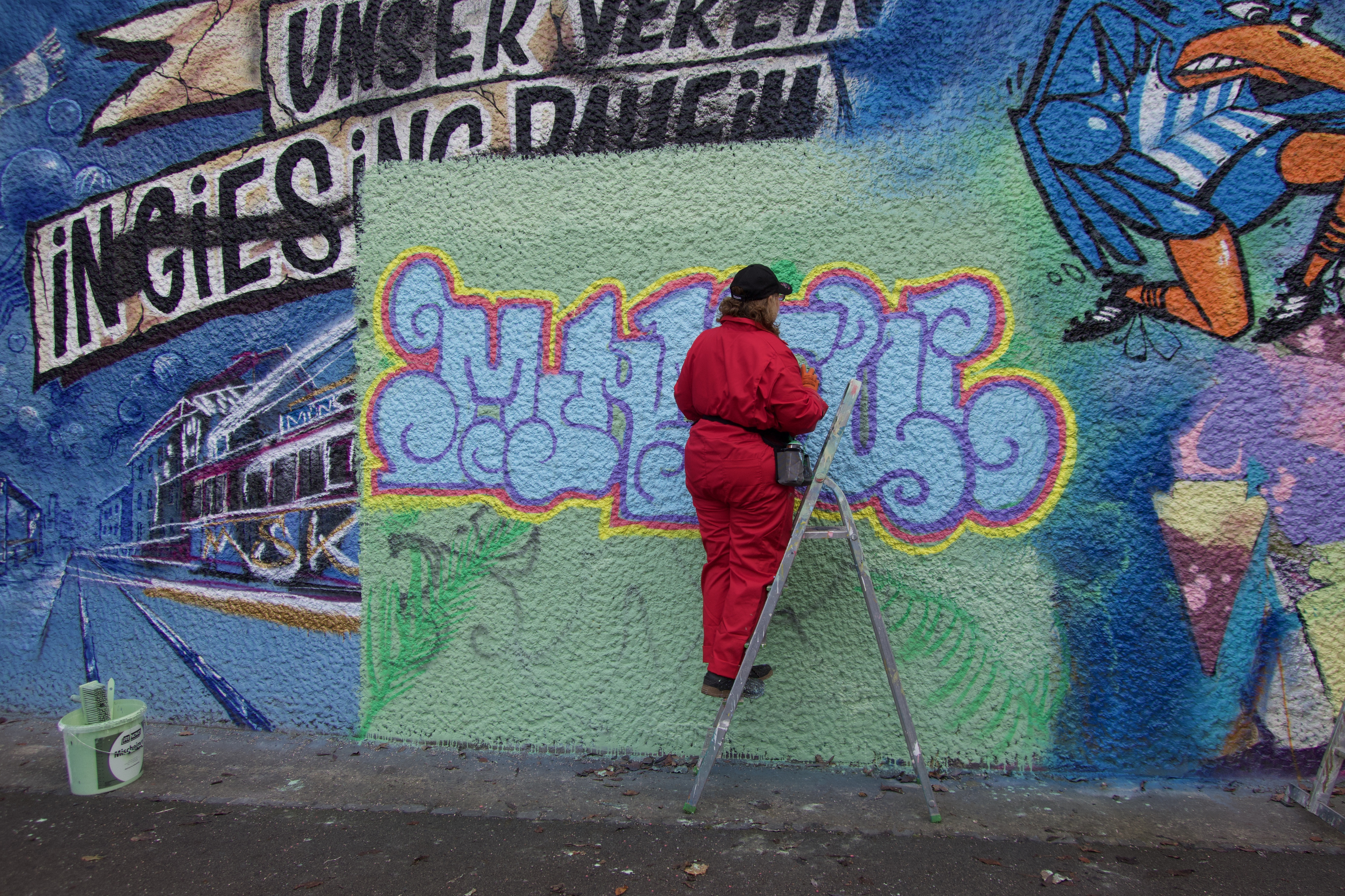 Jugendliche arbeiten an einem großflächigen Motiv mithilfe eines Projektors, gegenüber malen Künstler:innen auf einem Gerüst mit Farbrolle ein Bild und daneben sprüht jemand seinen Namen in aufwendiger bunter Schrift. Ein paar Meter weiter hält ein Mädchen, hält zum ersten Mal eine Spraydose in der Hand und tastet sich vorsichtig an die Wand heran. Neben ihr steht ein älterer Sprüher und teilt seine Tipps und Tricks. Immer wieder bleiben Passant:innen stehen, manche schauen nur kurz, andere bleiben länger, stellen Fragen oder kommen ins Gespräch.