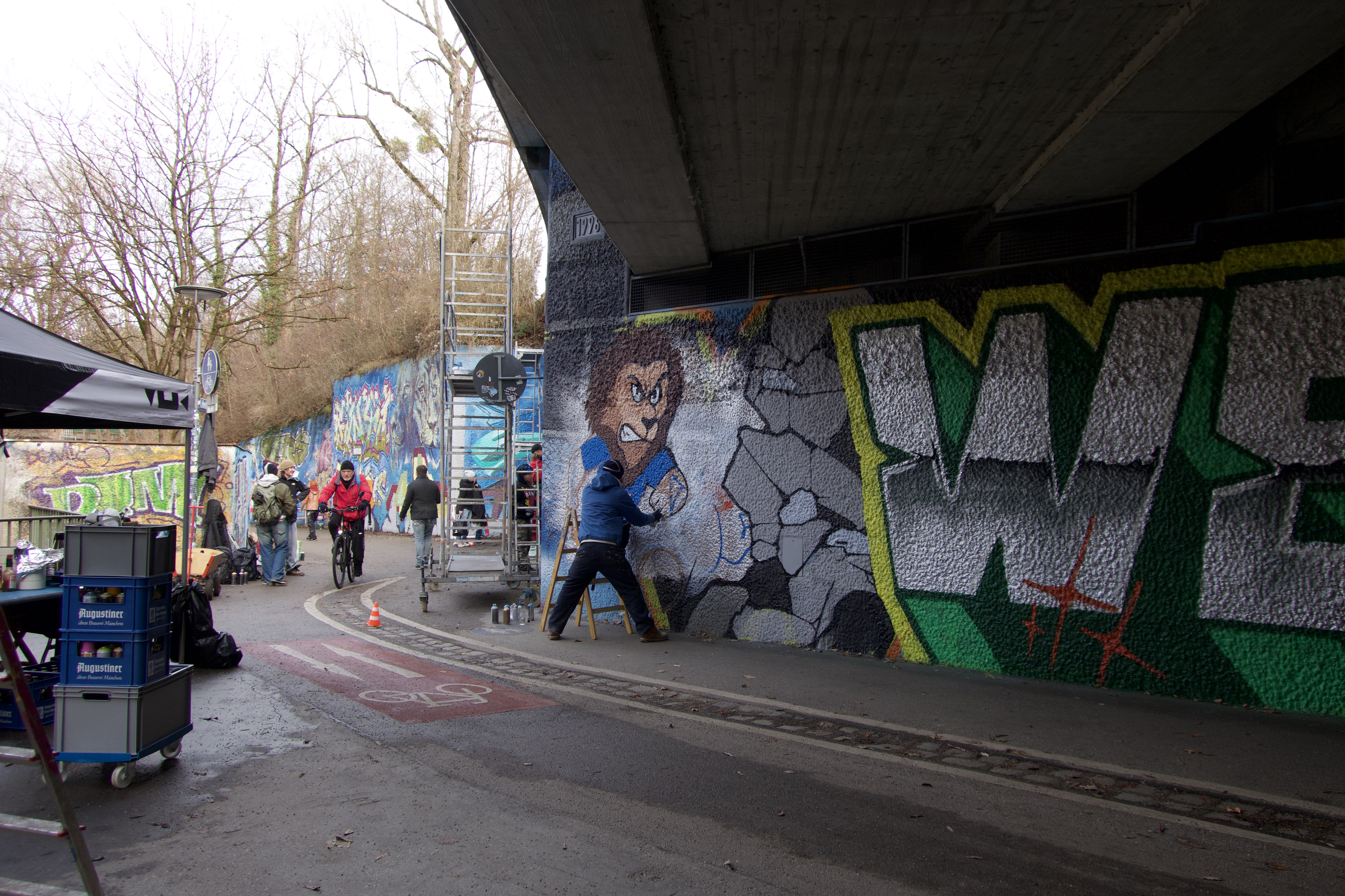 An einem grauen Dezembervormittag in Giesing, während viele noch zuhause sind, ist in den Isarauen unterhalb des Grünwalderstadion schon etwas ganz anderes in Bewegung. Zwischen den leichten Nieselregen und das Rauschen des Auer Mühlbaches mischen sich Musik, Gesprächsfetzen und der unverwechselbare Geruch von frischer Farbe. Wer heute in Richtung des Candidplatzes spazieren geht, merkt schnell: Hier passiert etwas.