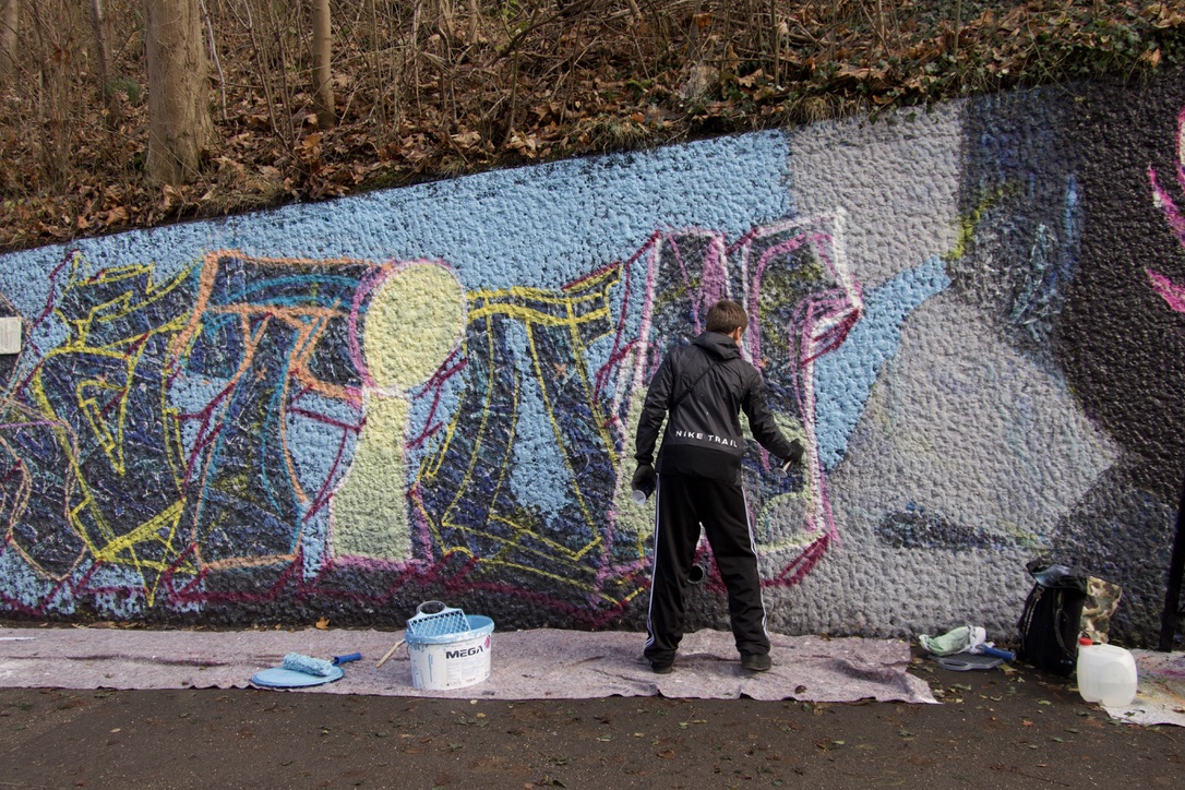 Jugendliche arbeiten an einem großflächigen Motiv mithilfe eines Projektors, gegenüber malen Künstler:innen auf einem Gerüst mit Farbrolle ein Bild und daneben sprüht jemand seinen Namen in aufwendiger bunter Schrift. Ein paar Meter weiter hält ein Mädchen, hält zum ersten Mal eine Spraydose in der Hand und tastet sich vorsichtig an die Wand heran. Neben ihr steht ein älterer Sprüher und teilt seine Tipps und Tricks. Immer wieder bleiben Passant:innen stehen, manche schauen nur kurz, andere bleiben länger, stellen Fragen oder kommen ins Gespräch.