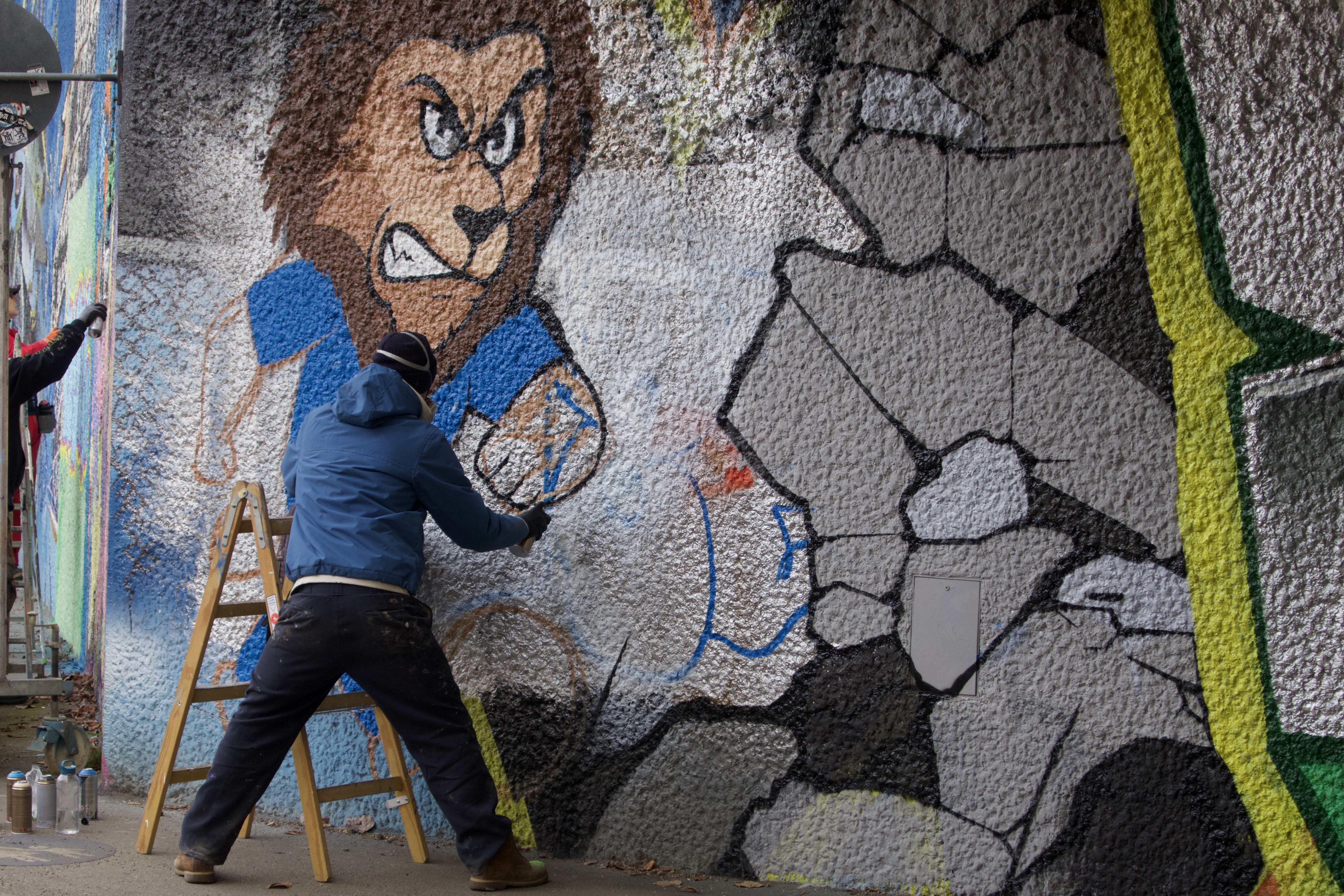 Das Ergebnis ist ein vielschichtiges Wandbild, das (lokale) Identität und popkulturelle Bezüge vereint. Große, farbintensive Schriftzüge treffen auf persönliche Tags, aufwendige Pieces und detaillierten Figuren. Dazwischen tauchen auch immer wieder bekannte Bilder auf: ein Phönix, bekannte Comiccharaktere, aber auch klare Bezüge zum Viertel. Besonders präsent sind Motive rund um den TSV 1860 München. Kein Zufall, schließlich thront nur wenige Meter oberhalb der Wand das Grünwalder Stadion und der nahegelegene Candidplatz dient vor den Heimspielen als „Löwentreff“. Die Wand wird zu einer Art Spiegel des Umfelds: Sie zeigt, wer hier unterwegs ist, was die Menschen beschäftigt und womit sie sich identifizieren.