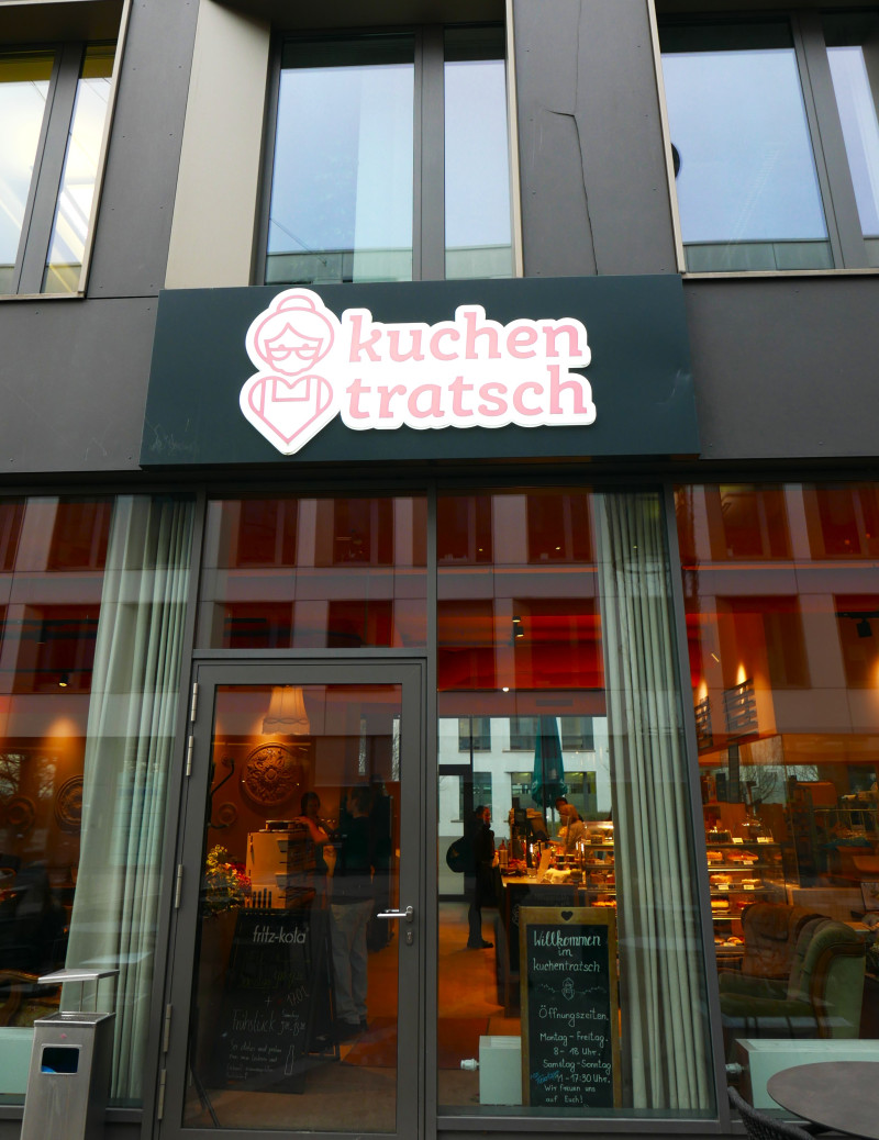 Das Café Kuchentratsch an der Theresienhöhe 30 sieht von außen erst einmal unscheinbar aus, relativ versteckt zwischen mehrstöckigen Büro- und Schulgebäuden. Doch sobald man die Tür öffnet und eintritt begrüßt einen das einladende, rosa, vintage-Ambiente samt herrlichem Konditorei-Duft.